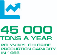 Hydrogen and chlorine are formed as by-products during electrolysis of salt solutions, therefore further development of the enterprise was concentrated on highest possible neutralization of chlorine aiming to ensure process and environmental safety. In 1966, commissioning of the production shop of polyvinyl chloride of 45.000 t/a capacity.