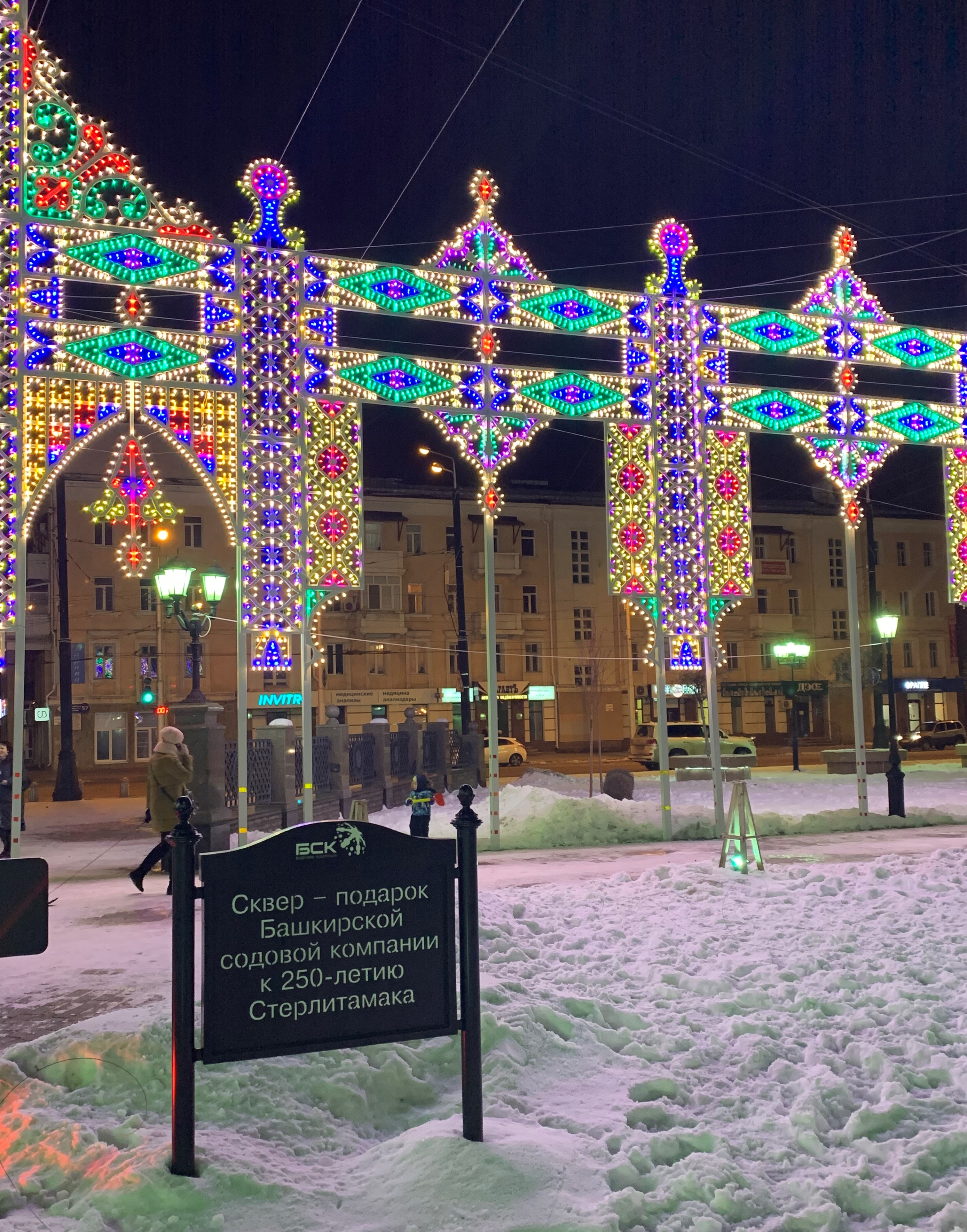 В Стерлитамаке зажглись новогодние огни в сквере у кинотеатра «Салават». Объемная световая композиция, включающая узорные ворота, арку, стелы и иные элементы, состоит из десятков тысяч ярких светодиодов.