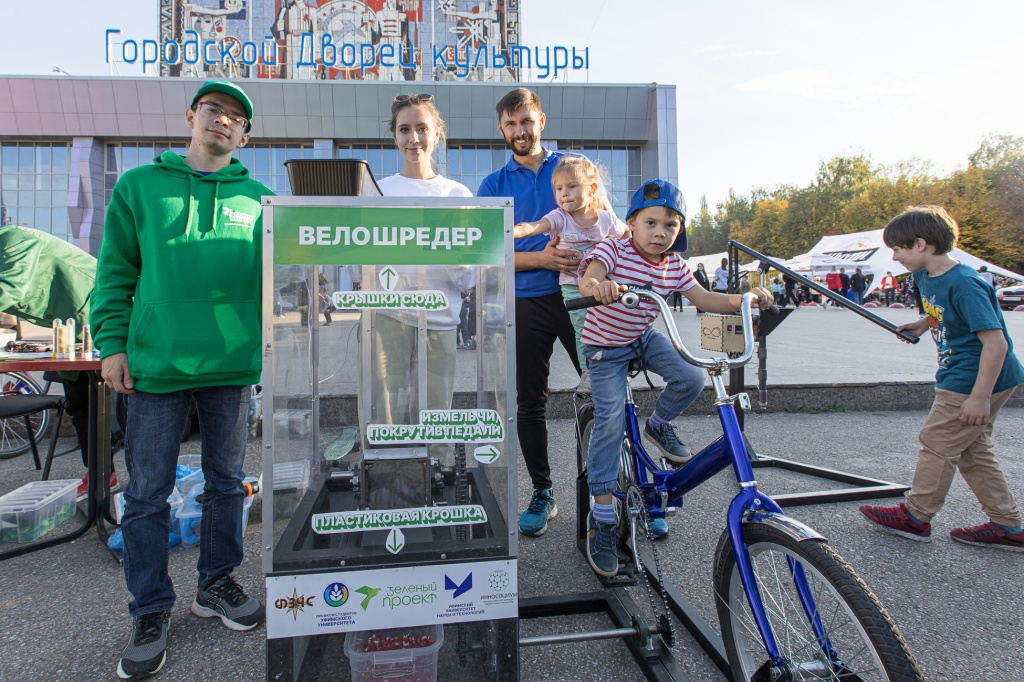 Появился на празднике и необычный «экологический велосипед»: велошредер для измельчения пластиковых крышек. С его помощью каждый желающий из отслужившего мелкого пластика мог изготовить полезную вещь.