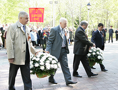 Под звуки духового оркестра колонна участников мероприятия направилась в парк им. Г.К.Жукова – традиционное место встречи ветеранов. Георгиевские ленточки на лацкан пиджака - символ Победы, корзины цветов и гирлянды к Стене Памяти – открытие празднования. Все это - дань уважения тем, кого уже нет с нами.
