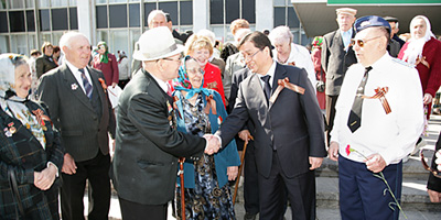 «Уважаемые ветераны и труженики тыла! От лица многотысячного коллектива предприятия поздравляю вас с Днем Великой Победы! С Днем возрождения нашей России! В этот день мы вспоминаем великий подвиг наших отцов и дедов, отстоявших свободу и независимость Родины. В каждой семье жива память о страшных днях той войны, жива гордость за тех, кто заслонил собой мир от фашизма. Те внимание и забота, которые сегодня мы оказываем нашим ветеранам, несоизмеримы с подвигом, который вы совершили. Мы поддерживаем курс Президента на усиление патриотического воспитания, значимости нашего исторического прошлого и заслуг России во второй мировой войне. От всей души желаем вам крепкого здоровья, долгих лет жизни, тепла и заботы родных и близких, мира, благополучия и согласия!»